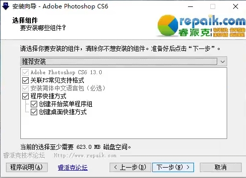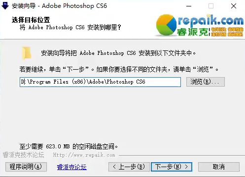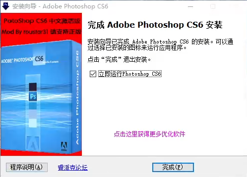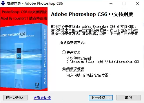 解压PhotoshopCS6.rar文件,双击PhotoshopCS6.exe文件,可以选择快速安装,也可以指定路径安装,一直下一步即可