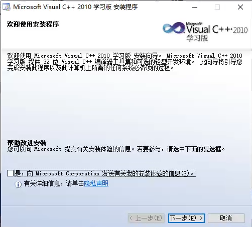 解压 VC2010.rar,找到 VC2010\Visual C++ 2010下面的 setup.exe,首先取消勾选发送安装信息,点下一步