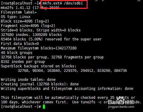 下一步是格式化分区,我们输入mkfs.ext4 /dev/sdb1 (1就是上一步的分区编号)。