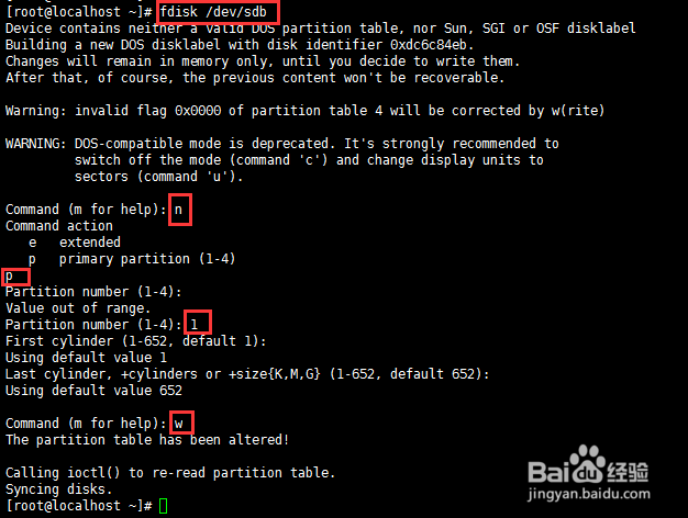 然后,我们为这个硬盘创建分区,输入fdisk /dev/sdb,依次输入n,p,1,w,其中n分别表示创建一个新分区,p表示分区类型为主分区,1表示分区编号是1,w表示保存